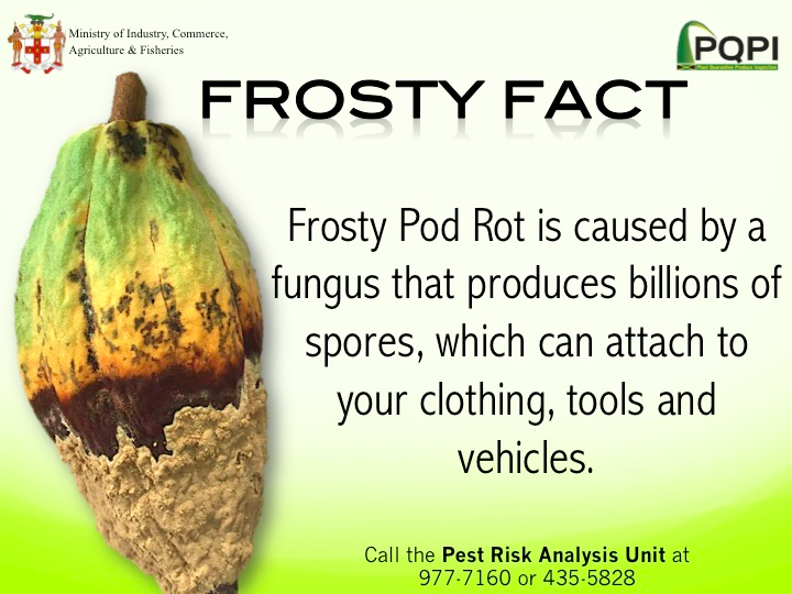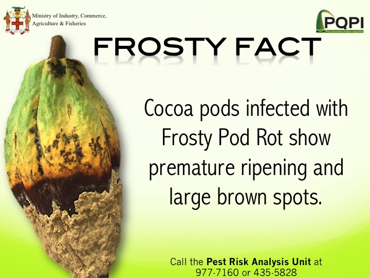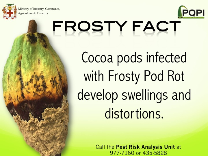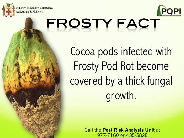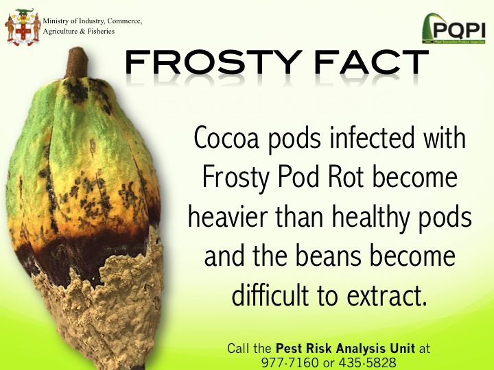 Frosty pod is a disease that affects cocoa and it is caused by a fungus (Moniliophthora roreri). It can cause serious damage to the cocoa industry reducing crop yield up to 80% per year.